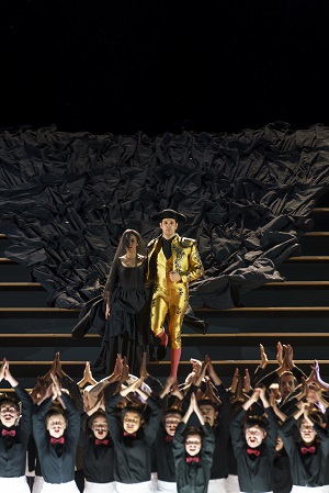 To ostatnie słowo, obok pantomimy i wodewilu, wydaje się kluczowe dla elementów stylu tej produkcji. Kropkę nad „i” stawia ostatnia scena, w której reżyser postanowił, że Carmen (Anaik Morel), która właśnie zginęła pchnięta nożem przez swego byłego kochanka, po chwili wstaje i gestem rozłożenia rąk kończy operę. Owszem wywołuje to uśmiech na twarzach widzów, ale możliwe, że jako wyraz mieszanych uczuć.