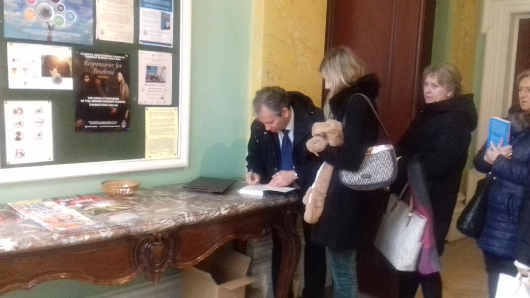 Redaktor Krzysztof Tadej podpisuje egzemplarze książki „Zapach Boga” w parafii South Kensington, 2 lutego 2020.